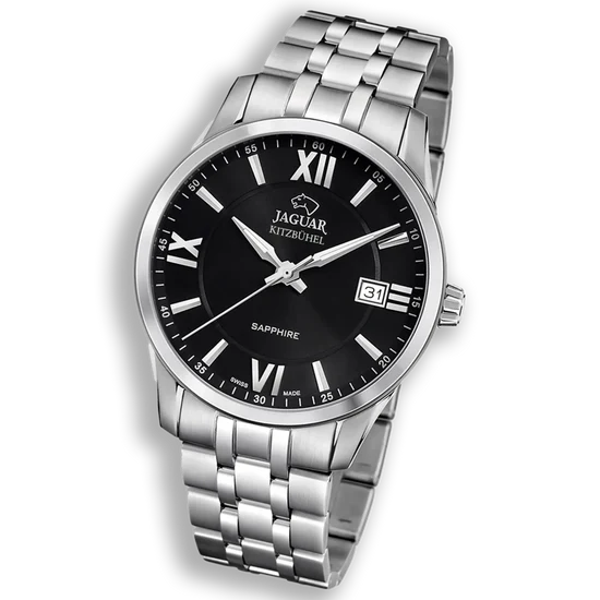 Die KB Uhr Jaguar® Acamar Classique J964-4 besticht durch ein zeitloses und elegantes Design. Mit ihrem silbernen Zifferblatt, dem glänzenden Edelstahlgehäuse und dem feinen Edelstahlarmband strahlt diese Uhr Stil und Qualität aus. Die klaren Linien, die schlanken Zeiger sowie das prominent platzierte Jaguar-Logo und der Kitzbühel-Schriftzug unterstreichen die Verbindung von Luxus und klassischem Stil. Materialien wie hochglanz-polierter Edelstahl und kratzfestes Saphirglas sorgen für Langlebigkeit und ansprechende Optik. Die Uhr ist mit einem präzisen Schweizer Quartzwerk ausgestattet, das zuverlässige Zeitmessung gewährleistet, und bietet eine Wasserdichtigkeit von bis zu 100 Metern, ideal für Schwimmen und Schnorcheln. Weitere Funktionen beinhalten ein praktisches Datumsfenster bei der 3-Uhr-Position sowie leuchtende Zeiger für gute Ablesbarkeit bei schlechten Lichtverhältnissen. Die Acamar Classique J964-4 richtet sich an anspruchsvolle Kunden, darunter Geschäftsleute, Freizeitenthusiasten und Uhrenliebhaber, die Wert auf Eleganz, Präzision und Funktionalität legen. Mit ihrem eleganten Silber-Design und umfassenden Funktionen vereint diese Uhr Qualität und Stil und ist der ideale Begleiter für den modernen Menschen. Art.-Nr.: KB-964-4
